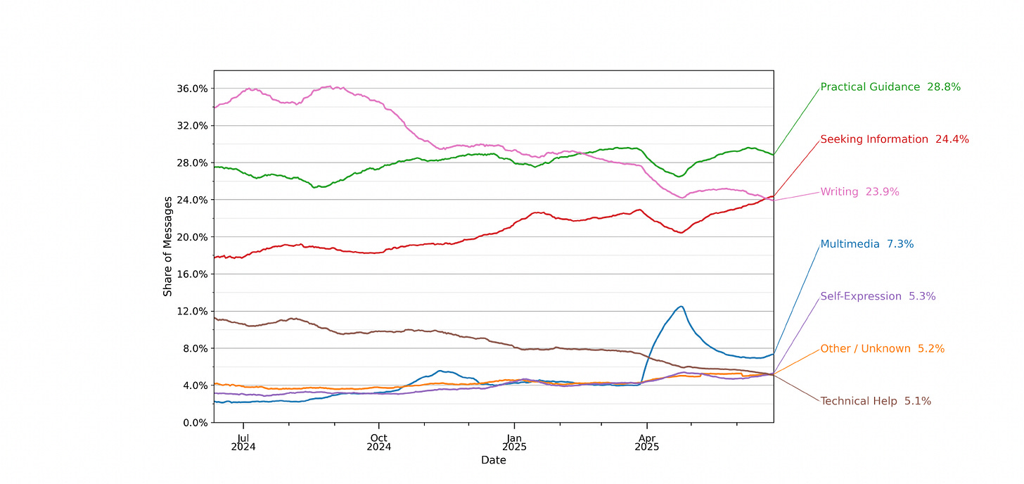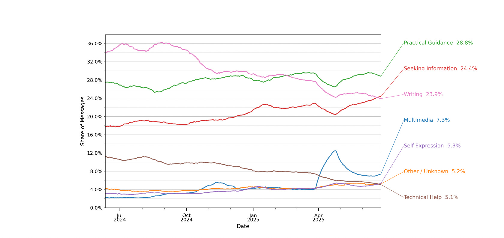 Wat doen mensen precies? Drie thema’s domineren samen zo’n 77–78% van alle gesprekken: Practical Guidance (hoe-doe-ik-dit), Seeking Information (wat-is-waar) en Writing (help me schrijven). Bij werkgerelateerde prompts is Writing de koploper met ongeveer 40%; en twee derde van dat schrijfwerk is geen “maak iets nieuws”, maar “verbetér wat ik heb”. Klinkt als redactie, niet als magie. Intussen blijft coderen klein (4,2% van alle gesprekken) en relaties/therapie nog kleiner (1,9%). AI is dus vooral je nuchtere copiloot, niet je levenscoach.