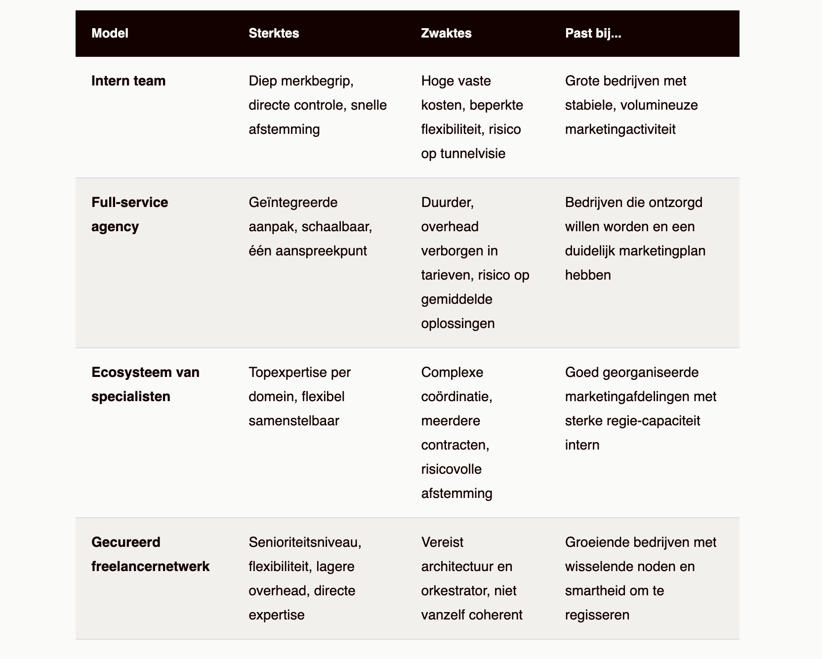 Je staat voor een keuze die elke marketeer op een gegeven moment moet maken: hoe organiseer ik mijn marketingcapaciteit? Zet je alles intern op? Klop je aan bij een full-service agency? Spreek je een reeks gespecialiseerde bureaus aan? Of ga je voor iets anders - een samengesteld netwerk van senior freelancers die je inzet als een soort eigen team zonder de vaste loonlast?