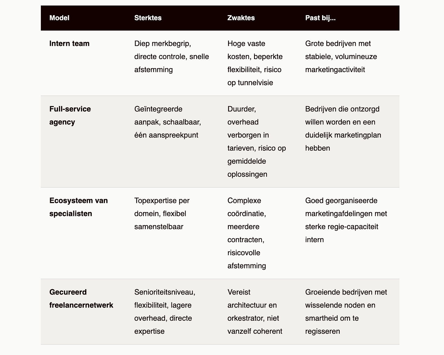 Want “een paar freelancers inschakelen” is niet hetzelfde als “werken met een gecureerd netwerk van senior marcom-experts”. Het verschil zit niet in de contractvorm. Het zit in de architectuur erachter.