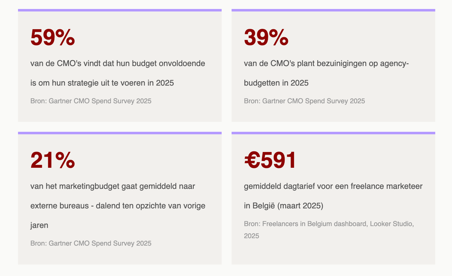 Bronnen: Gartner CMO Spend Survey 2025 (n=402 CMO’s, Noord-Amerika en Europa, feb-mrt 2025) | Gartner CMO Spend Survey 2024 | Malt Freelancing in Europe 2024 | Freelancers in Belgium Looker Studio Dashboard (gemiddeld dagtarief 18/3/2025) | Ariad Digital Talent Survey 2023 | TriFinance Freelance Market Survey Belgium 2022 (n=219 respondenten)