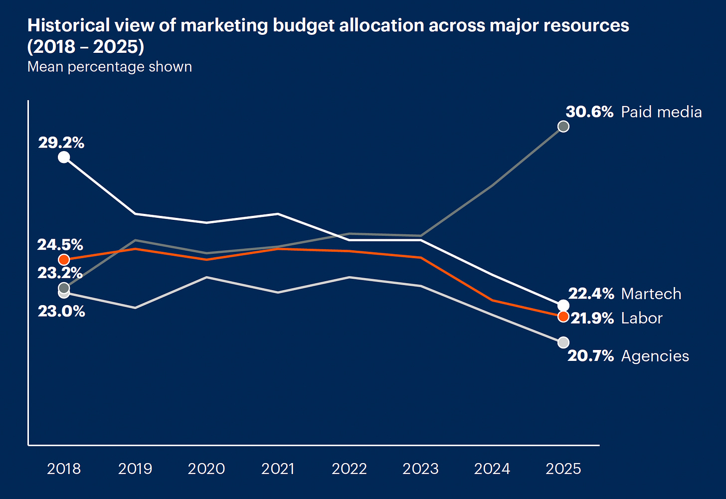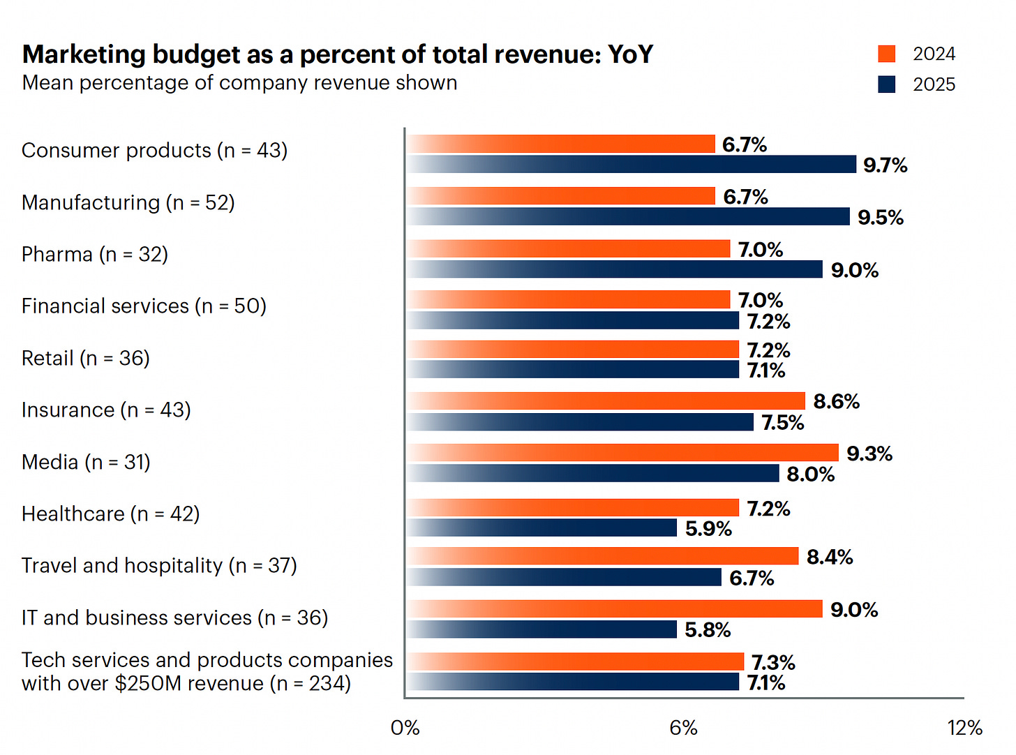 Bron: Gartner CMO Spend Survey 2025 – Data Snapshots, Marketing Budget & Efficiency Benchmark (mei 2025).