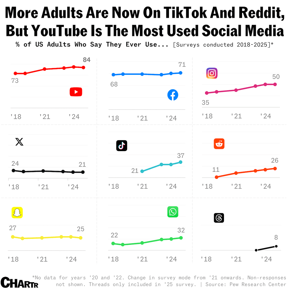 Van 21% in 2021 naar 37% in 2025 - en dat is niet zomaar groei, dat is metamorfose . Bij jongeren is dat gebruik hallucinant: 65% van de 18–29-jarigen zit op TikTok, waarvan bijna de helft dagelijks .