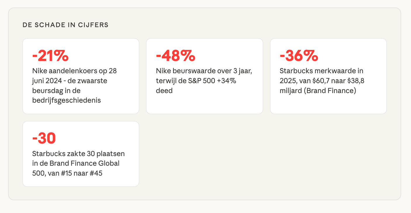 Beide bedrijven zijn nu - moeizaam - aan het terugkeren naar brandbuilding. Nike lanceerde de “Winning Isn’t For Everyone”-campagne voor de Olympische Spelen en werd door Ad Age verkozen tot beste campagne van het jaar. Starbucks CEO Brian Niccol lanceerde “Back to Starbucks” en draait de performance-first-logica terug. De les kost ze samen een marktkapitalisatieverlies dat in de tientallen miljarden loopt.