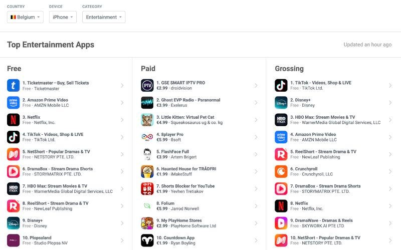 In de App Store van 30 juli 2025, België staan ReelShort, DramaBox, NetShort en DramaWave in de top 10 van meest opbrengende entertainment-apps. Niet even piepen. Nee, structureel. Meer inkomsten dan Netflix. Meer gebruik dan HBO Max.
