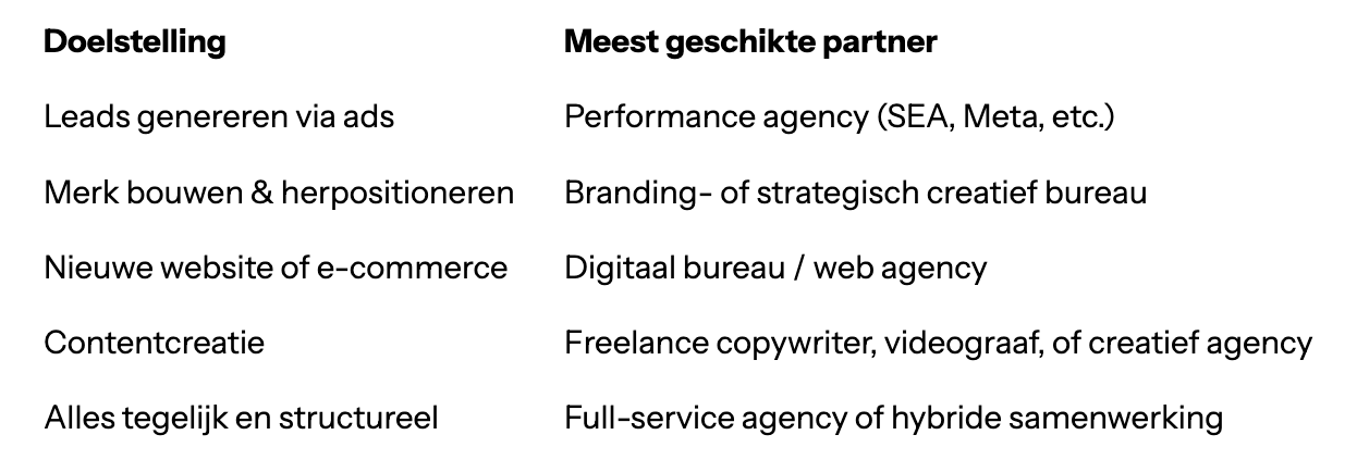 ➡ Hybride modellen werken vaak het best: Bijv. een interne marketeer als regisseur, die freelancers inzet voor content en met een agency samenwerkt voor campagnes of digitale projecten.
