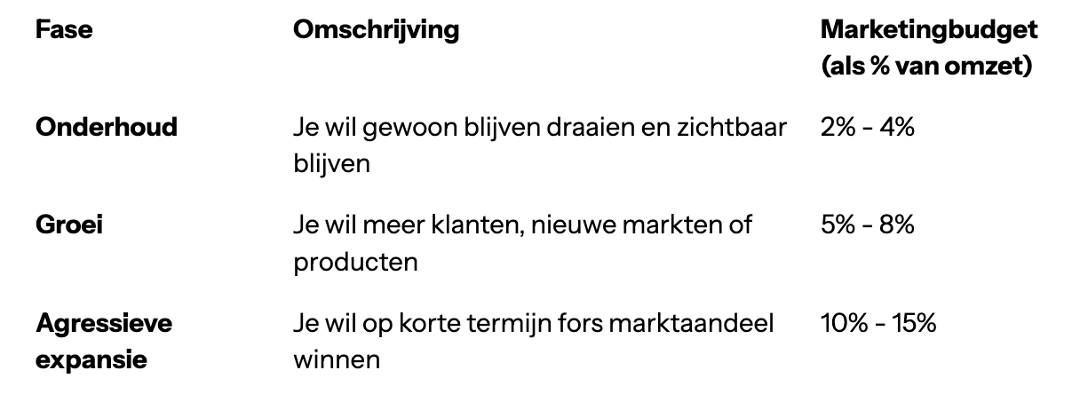 Voor een KMO met 2 miljoen euro omzet betekent dat dus een jaarlijks marketingbudget tussen de 40.000 en 160.000 euro. Dat lijkt veel, maar dat is inclusief alles: je website, je campagnes, je marketingtooling én externe partners.