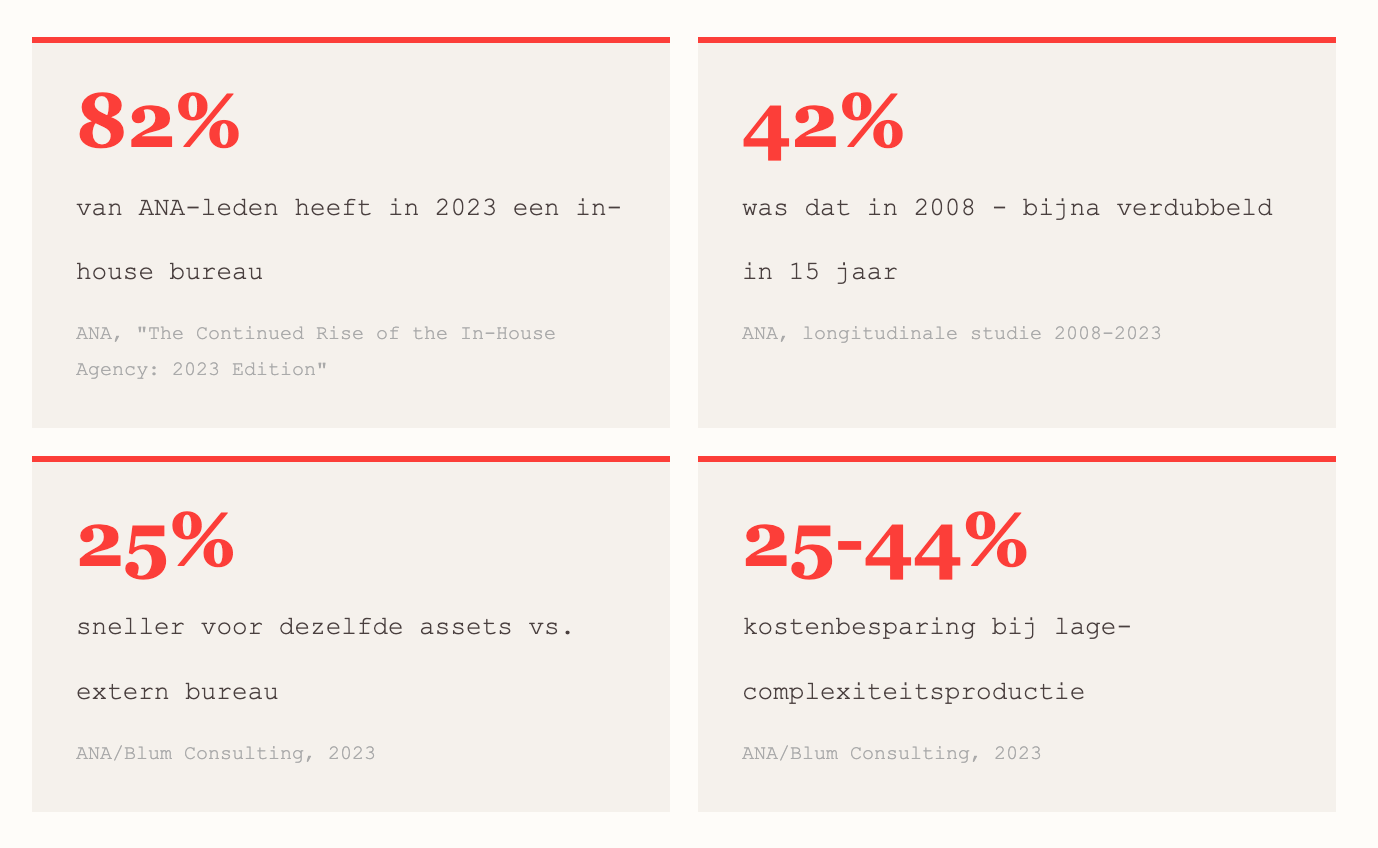 Bronnen: ANA “The Continued Rise of the In-House Agency: 2023 Edition” (mei 2023) · ANA/Blum Consulting “Quantifying the Value of the In-House Agency” (september 2023) · WFA/Observatory International “Global Trends in Creative In-Housing” (2020, update 2023) · TrinityP3 “In-House Agency Services Guide” (2025) · TrinityP3 “The often-hidden cost of in-house agencies” (november 2024) · IHAF/Forrester “Managing In-House Agency Creative” · Cella “In-House Intelligence Report” (2024) · eMarketer “AI-driven creative tools expand fast, challenging the traditional agency model” (december 2025) · IPA “Shift Happens” (2023) · Digiday “The case for and against bringing programmatic in-house” (2024)