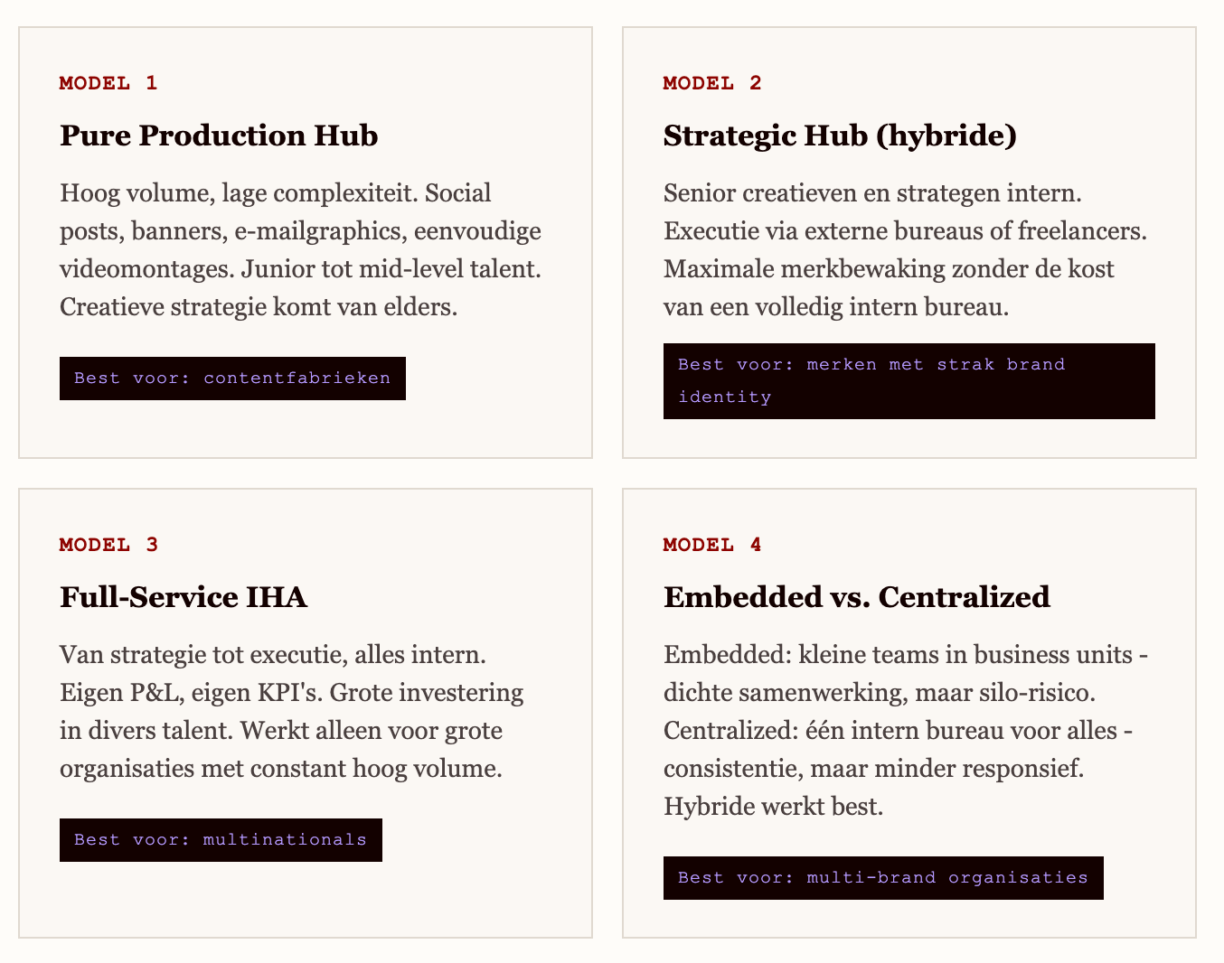 Het beste model is het model dat past bij jouw volume, jouw disciplines, jouw organisatiecultuur en jouw budget. Niet bij dat van het bedrijf dat gisteren in Marketing Week stond.