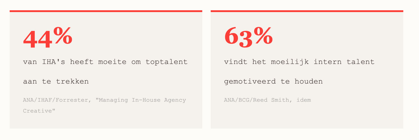 71 procent van IHA-leiders heeft geen of weinig tijd voor coaching. Dat is een retentietijdbom. Zorg voor externe training, zet zijdelingse projecten op, laat mensen af en toe aan externe pitches of sectorevenementen deelnemen. Een intern team dat nooit buiten de muren kijkt, droogt creatief op.