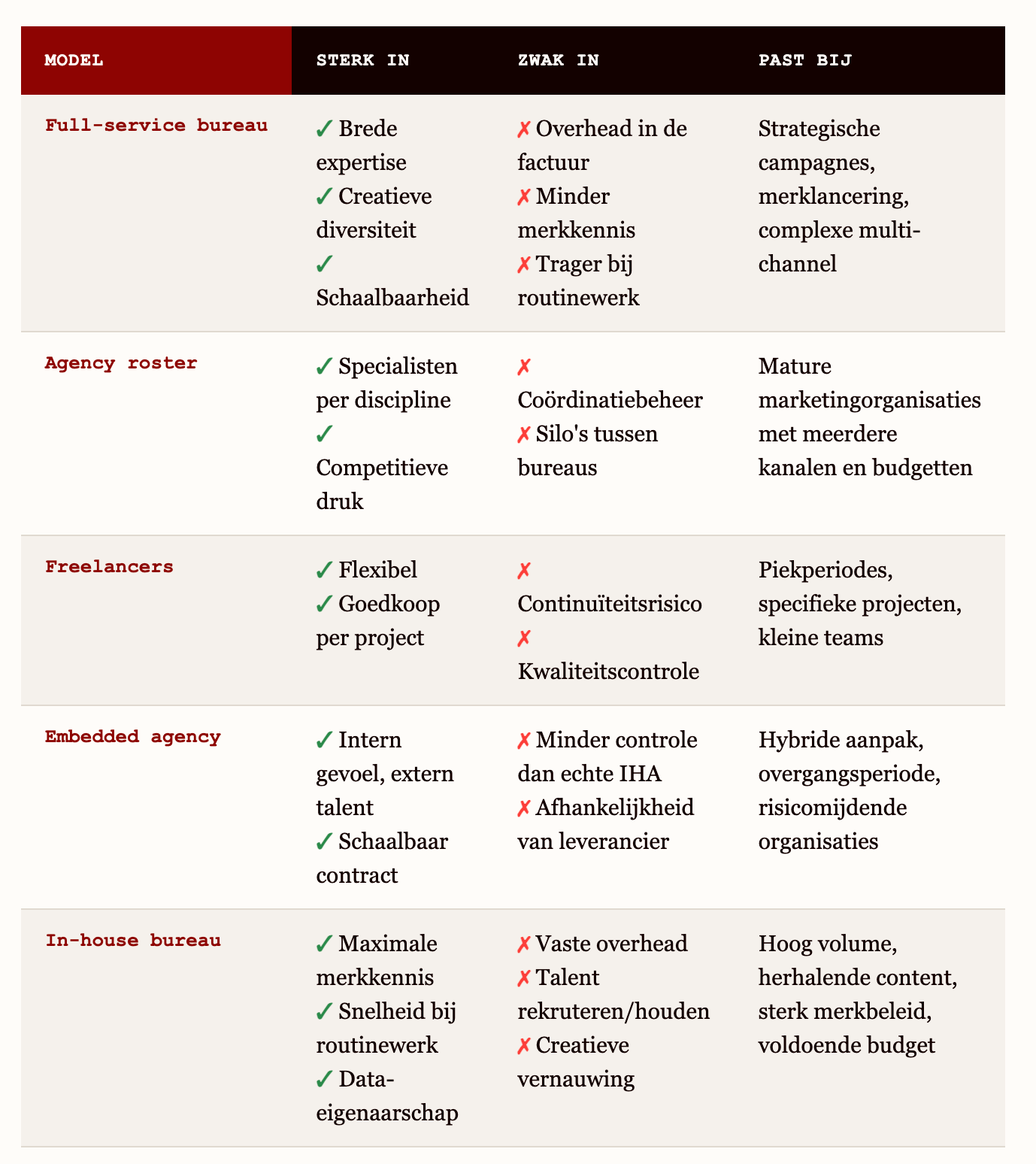 Het is één optie naast full-service bureau, roster, freelancers en embedded modellen - geen vervanging voor alles