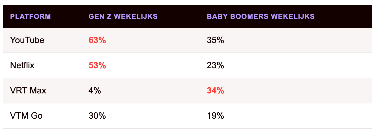 YouTube is wekelijks meest gebruikte videoservice in België - vóór Netflix. Bij Gen Z gebruikt 63% YouTube wekelijks.