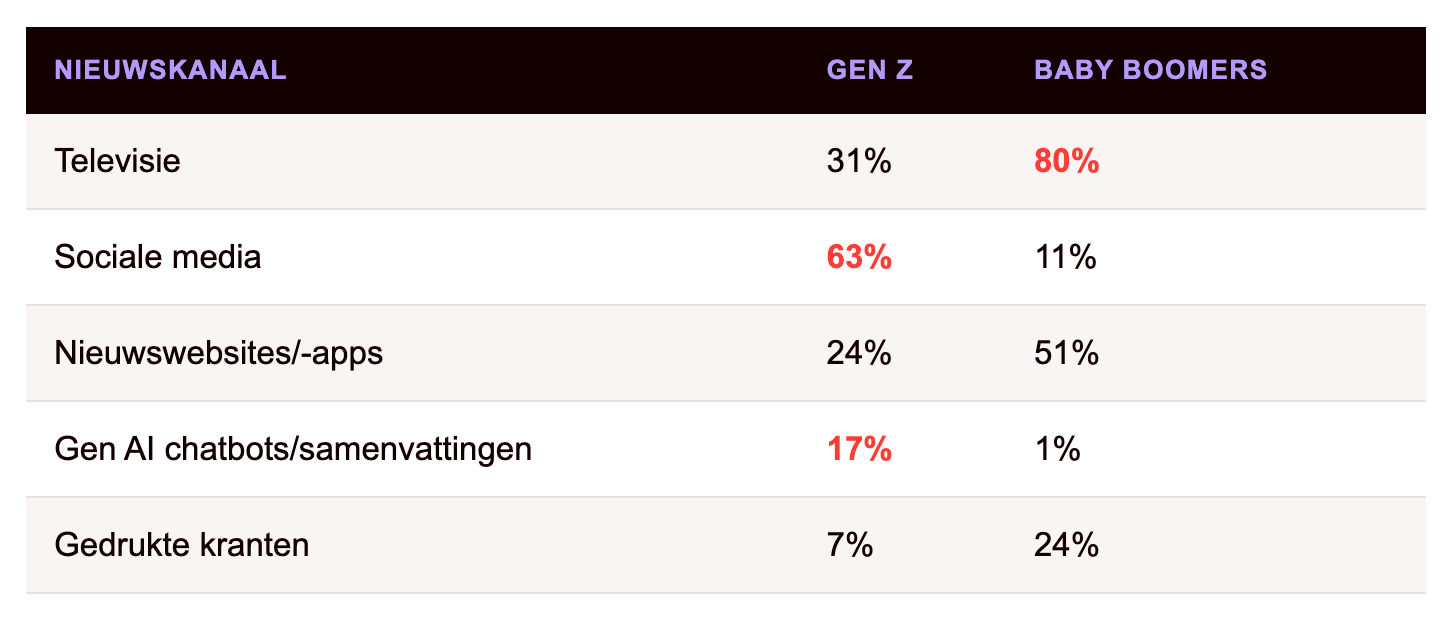 17% van Gen Z gebruikt Gen AI-tools als nieuwsbron. Dat is bijna het dubbele van gedrukte kranten bij diezelfde leeftijdsgroep, en bijna evenveel als nieuwswebsites. Een kanaal dat vijf jaar geleden niet bestond, is nu een primaire nieuwsbron voor een significante groep jonge Belgen.