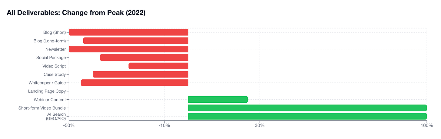 Het rapport beschrijft het haast cinematografisch: 2022 was de piek van klassieke contentpricing, 2023 was de explosie van AI-adoptie, 2024 werd de race naar efficiëntie, en in 2025 zien we de nieuwe marktlogica ontstaan. Commodity writing daalde met 43%, maar agencies die AI omarmen draaien 40 tot 60% hogere marges door workflows te optimaliseren en teams slimmer in te zetten.