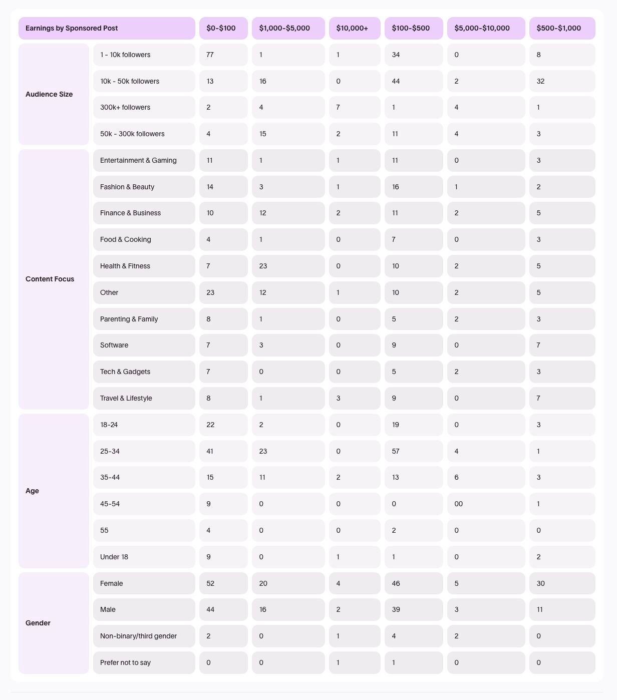 De meeste micro-influencers (1-10k volgers) verdienen tussen de 0 en 100 dollar per post. Enkelingen pieken richting de $500–$1.000, maar het is duidelijk: bereik is nog altijd de grootste hefboom op prijs.